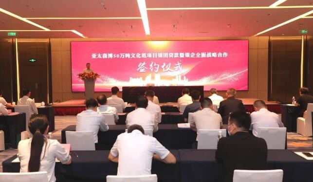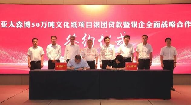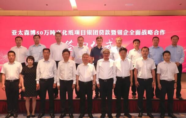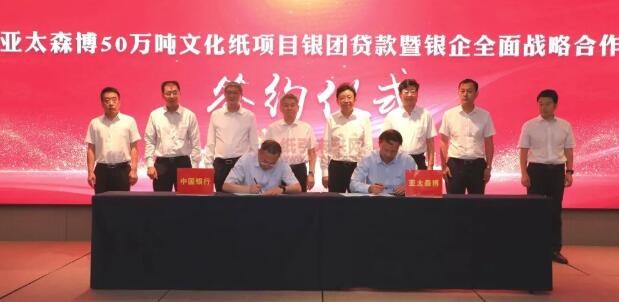 紙引未來網訊 6月28日,中國銀行日照分行牽頭中國進出口銀行山東省分行、工商銀行日照分行、農業銀行日照分行、建設銀行日照分行、交通銀行日照分行、平安銀行青島分行、民生銀行日照分行舉辦亞太森博50萬噸文化紙項目銀團貸款暨銀企全面戰略合作簽約儀式,8家金融機構將共建銀團,為亞太森博50萬噸文化紙項目建設提供35.5億元貸款支持及其他金融配套服務。