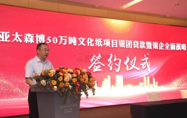 中國銀行日照分行行長徐明遠在簽約儀式上致辭,他表示,作為世界領先的漿紙一體化企業,亞太森博(山東)漿紙有限公司一直是漿紙行業產業升級、技術進步、綠色發展的標桿企業,本次年產50萬噸文化紙項目正是亞太森博響應政府號召,推動產業結構調整優化和新舊動能加快轉換的重要舉措。金鷹集團是中國銀行全球最重要的合作伙伴,雙方緊密合作20余年,在共同成長過程中建立了深厚友誼,支持亞太森博重點項目建設,服務實體經濟發展是中國銀行踐行“融通世界造福社會”使命的重要體現。下一步,中國銀行將認真履行牽頭行職責,充分發揮中國銀行的國際結算品牌優勢和海內外一體化服務渠道,為亞太森博提供更專業、更優質、更高效的金融服務。