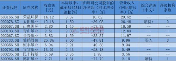 值得一提的是,最近30日內,太陽紙業、博匯紙業、仙鶴股份、岳陽林紙等4只紙漿概念股獲得了機構給予的“買入”或“增持”等看好評級。
