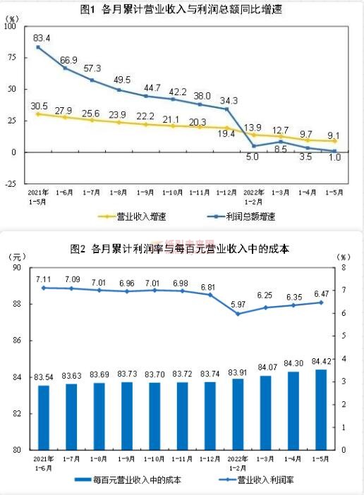 1—5月份,規(guī)模以上工業(yè)企業(yè)每百元營業(yè)收入中的成本為84.42元,同比增加0.83元;每百元營業(yè)收入中的費(fèi)用為7.88元,同比減少0.52元。