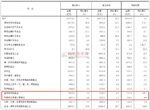值得關(guān)注的是,造紙和紙制品業(yè)實(shí)現(xiàn)營業(yè)收入6050.8億元,同比增長2.4%;利潤總額212.4億元,同比下降48.7%。印刷和記錄媒介復(fù)制業(yè)實(shí)現(xiàn)營業(yè)收入2847.6億元,同比增長0.8%;利潤總額136.1億元,同比下降9.6%。