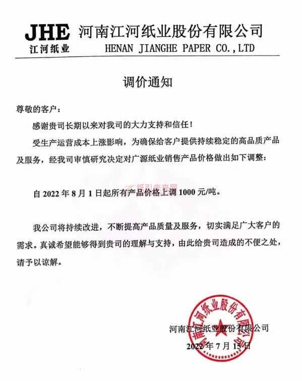 河南江河紙業:廣源紙業銷售產品價格自8月1日起,所有產品價格上調1000元/噸。