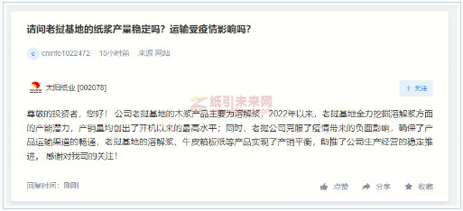 7月21日,太陽紙業在互動平臺回答投資者提問時表示,公司老撾基地的木漿產品主要為溶解漿,2022年以來,老撾基地全力挖掘溶解漿方面的產能潛力,產銷量均創出了開機以來的最高水平;同時,老撾公司克服了負面影響,確保了產品運輸渠道的暢通,老撾基地的溶解漿、牛皮箱板紙等產品實現了產銷平衡,助推了公司生產經營的穩定推進。