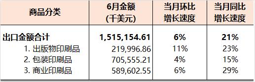 印刷產業三大類商品進出口規模持續擴大,其主要推動力源于印刷產業出口的大幅增長:1-6月份,國內印刷產業相關商品進出口規模同比增長11%,與疫情前的2019年同期相比增長30%。其中,國內印刷產業相關商品出口同比增長18%、與疫情前的2019年同期相比增長40%;與此相對比,同期國內印刷產業相關商品進口同比下降11%、與疫情前的2019年同期相比增長2%。