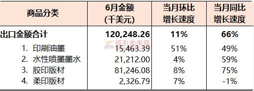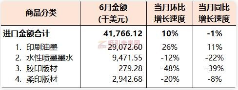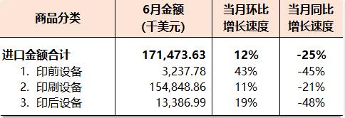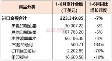 進口:期刊及雜志類印刷品(+240%)、PS膠印版材(+134%)、柔版印刷機(+36%)、凹版印刷機(+22%)、辦公類印刷品(+7%);