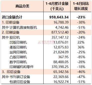相關設備主要品種進口,計算機直接制版機474.25萬美元(同比下降51%)、膠印機3.57億美元(同比下降24%)、凹版印刷機1307.60萬美元(同比增長22%)、柔版印刷機1287.58萬美元(同比增長36%)、絲網印刷機2182.41萬美元(同比下降25%)、凸版印刷機36.80萬美元(同比下降85%)、數字印刷機8848.81萬美元(同比下降28%)、印刷輔機和零件3.70億美元(同比下降18%)、書刊裝訂設備2236.97萬美元(同比下降47%)、包裝印后設備1692.27萬美元(同比下降51%)。