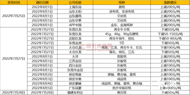 近期受國際原材料影響進(jìn)口木漿價(jià)格頻繁波動(dòng),再加上國內(nèi)各種化工原料價(jià)格不斷變化,整體的能源成本居高不下,各大紙廠相關(guān)產(chǎn)品價(jià)格也隨之波動(dòng)。本周各大紙廠報(bào)價(jià)以漲價(jià)為主,整體降價(jià)幅度在50~200/噸左右,部分極端廠商因?yàn)槿鄙贅鍧q價(jià)1000/噸。