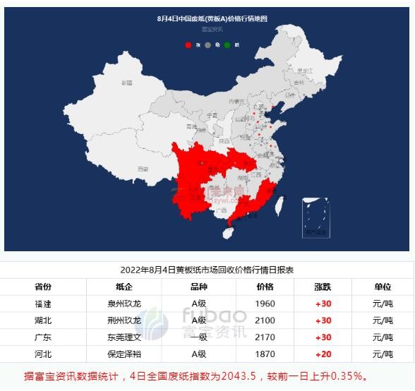 8月4日起湖北玖龍紙業上調30,調整后:甲級牛皮紙2580,乙級牛皮紙2360,Aa級2130,a級2100,B級2060,C級2020,D級1960,E級1910,純啤酒箱2020,廢雜紙1750,小統貨1850
