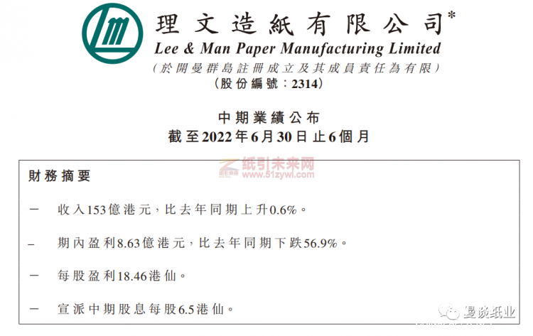 理文造紙有限公司公布了其截至2022年6月30日止6個月之中期業績。