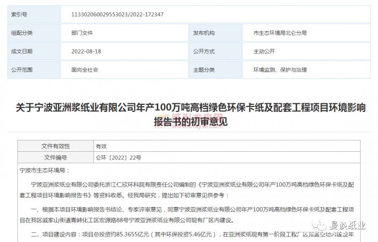 8月18日,寧波市生態環境局北侖分局發布《關于寧波亞洲漿紙業有限公司年產100萬噸高檔綠色環保卡紙及配套工程項目環境影響報告書的初審意見》。《意見》指出: