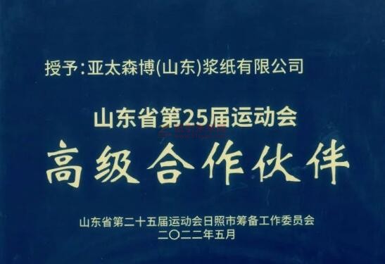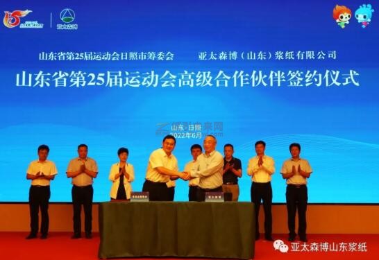 6月17日,亞太森博(山東)漿紙有限公司向山東省第25屆運動會日照市籌備工作委員會贊助800萬元人民幣,公司成為山東省第25屆運動會高級合作伙伴。