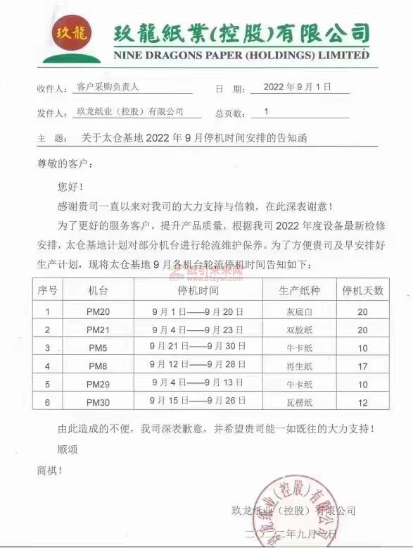 9月1日,新的一月開始,紙業市場卻依舊以停機檢修為主旋律。當天,玖龍紙業(太倉基地)發出停機函,宣布各紙機將從9月1日-30日輪停10-20天不等。