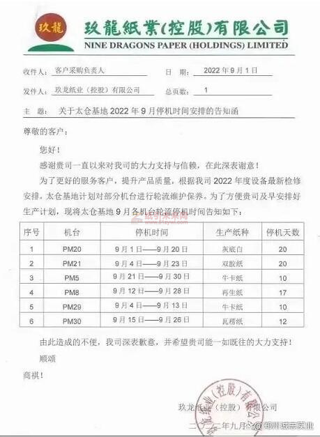 玖龍紙業(yè)太倉基地6臺(tái)紙機(jī)將從9月1日到30日,分別停機(jī)10-20天不等。6臺(tái)紙機(jī)分別是PM5、PM8、PM20、PM21、PM29、PM30,影響紙種包括灰底白、牛卡紙、再生紙、瓦楞紙、雙膠紙。停機(jī)計(jì)劃具體如下: