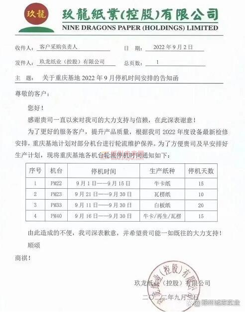 玖龍紙業(yè)重慶基地4臺(tái)紙機(jī)從9月1日起到9月30日,分別停機(jī)10-20天不等。重慶玖龍紙業(yè)目前有4條造紙生產(chǎn)線,分別是PM22、PM23、PM33和PM40,包括80萬噸牛卡紙、70萬噸瓦楞紙和50萬噸白板紙,總產(chǎn)能約200萬噸。停機(jī)計(jì)劃具體如下: