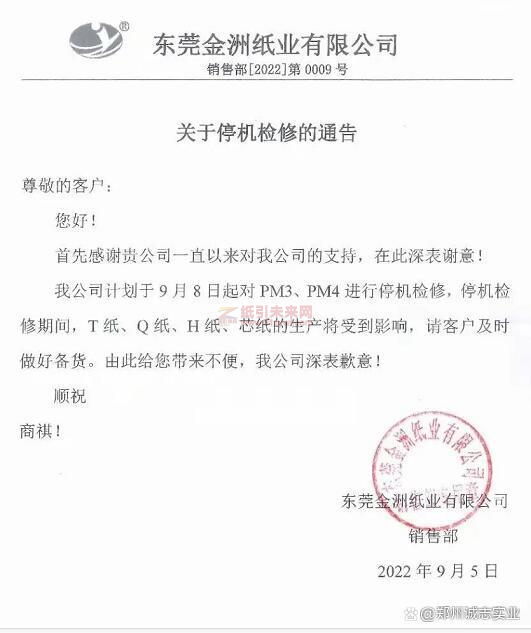東莞金洲紙業(yè):9月8日起對(duì)PM3、PM4進(jìn)行停機(jī)檢修,停機(jī)檢修期間,T紙、Q紙、H紙、芯紙的生產(chǎn)將收到影響。