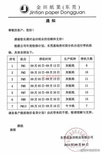 東莞金田紙業(yè):PM1、PM2、PM5、PM6、PM7、PM8和PM13等7臺(tái)紙機(jī)將在9月5日到9月30日期間,停機(jī)7-16天不等,產(chǎn)品包括灰板紙和牛卡紙。