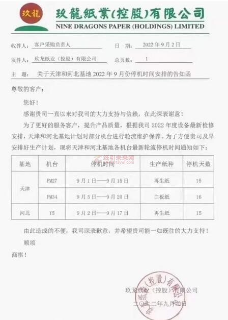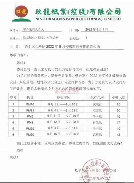 玖龍紙業(yè)天津和河北基地,3臺紙機(jī)PM27、PM34和Y5從9月1日到9月20日,分別停機(jī)15-16天,紙種包括再生紙和白板紙。在7月底公布的停機(jī)函中,PM34原計(jì)劃9月份停機(jī)9天,新的停機(jī)函顯示停機(jī)時(shí)間要延長到16天。