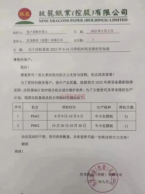 受此影響,與消費(fèi)密切相關(guān)的包裝紙企業(yè)也在本該一年中最賺錢的時(shí)候不得不停機(jī)保價(jià)。已經(jīng)在8月份連續(xù)發(fā)布停機(jī)函的玖龍紙業(yè),在9月初延續(xù)了停機(jī)節(jié)奏,東莞基地、泉州基地將停機(jī)時(shí)間從8月延續(xù)到9月。新的停機(jī)函顯示,太倉基地、重慶基地、沈陽基地、河北和天津基地將在9-10月繼續(xù)維持一個(gè)時(shí)間較長的停機(jī)階段。