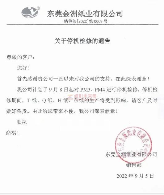 東莞金洲紙業(yè):9月8日起對PM3、PM4進(jìn)行停機(jī)檢修,停機(jī)檢修期間,T紙、Q紙、H紙、芯紙的生產(chǎn)將收到影響。