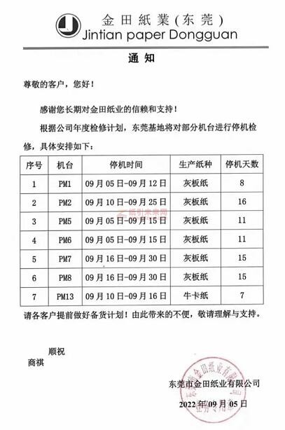 東莞金田紙業(yè):PM1、PM2、PM5、PM6、PM7、PM8和PM13等7臺紙機(jī)將在9月5日到9月30日期間,停機(jī)7-16天不等,產(chǎn)品包括灰板紙和牛卡紙。