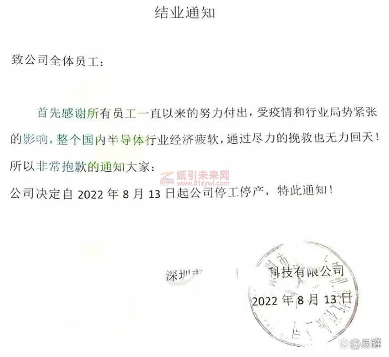 深圳市某科技企業表示,受疫情和行業局勢緊張的影響,整個國內半導體行業經濟疲軟,通過盡力的挽救也無力回天,決定自2022年8月13日起停工停產。