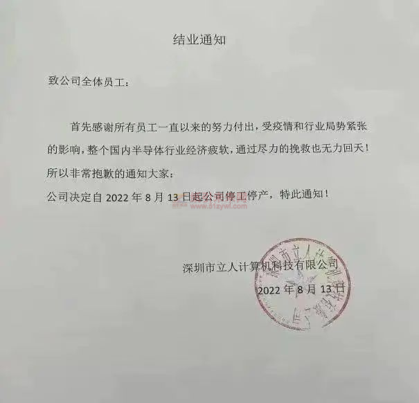 近日,網上流傳一家位于深圳的立人計算機科技有限公司因疫情和行業局勢緊張,疊加半導體行業經濟疲軟,決定自2022年8月13日起停工停產。