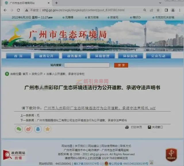6月14日,該企業遞交了《生態環境行政違法當事人公開道歉、承諾守法從輕處罰申請書》,20日,在廣州市生態環境局政務網站上刊登了公開道歉、承諾守法聲明書: