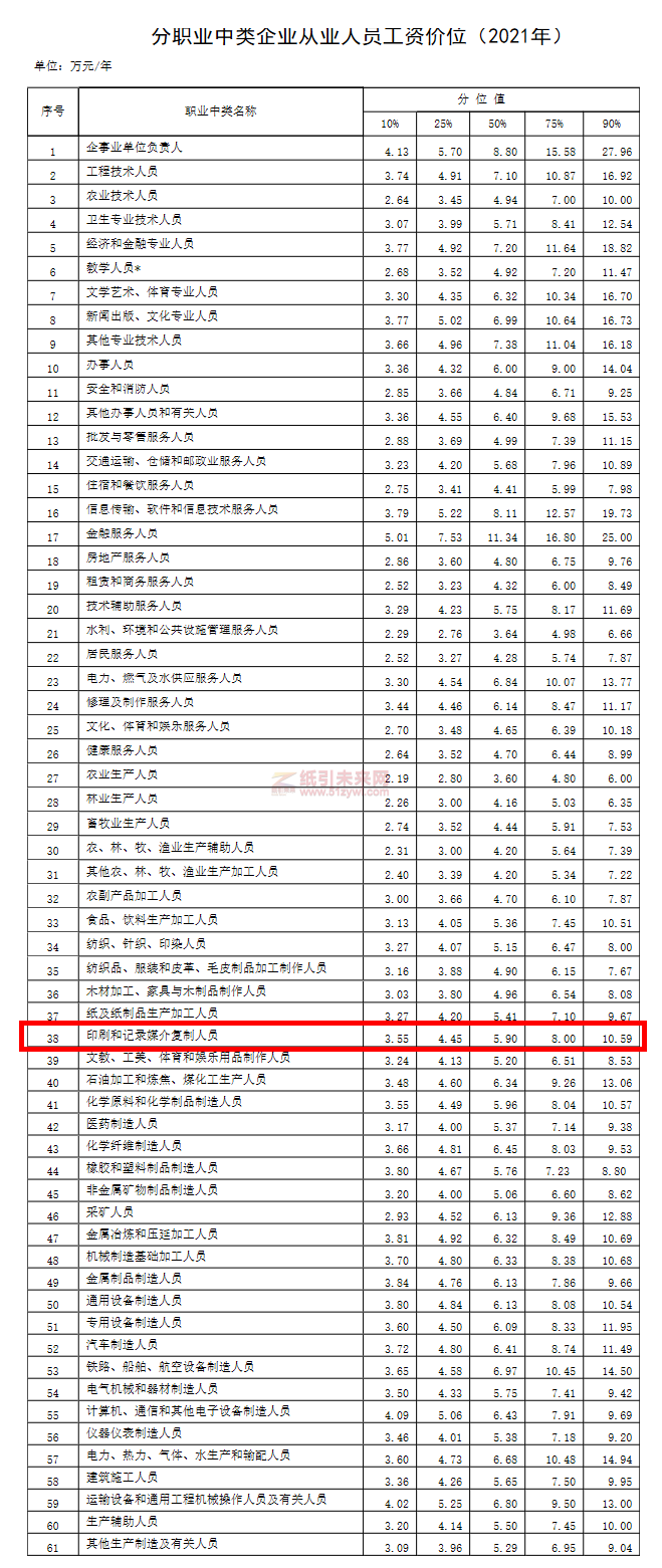 近日,人社部發布2021年企業薪酬調查信息,披露了不同職業從業人員工資價位數據。其中,“印刷和記錄媒介復制人員”工資價位分別為3.55萬元(10分位)、4.45萬元(25分位)、5.9萬元(50分位)、8萬元(75分位)、10.59萬元(90分位)。