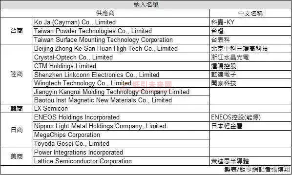 2021年新加入的臺廠包含臺燿科技、SMT供應商臺表科,以及鍵盤MTS(薄膜觸控開關)大廠科嘉-KY,而遭移除的則有雙鴻、良維、康控、致伸科、瑞儀、金箭印刷與先鋒材料。