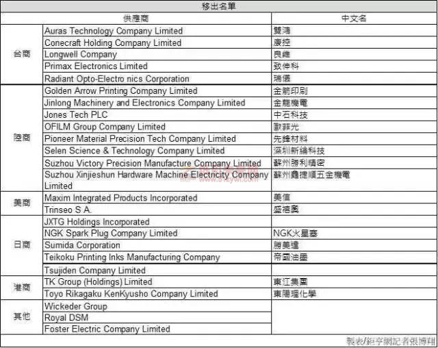 另據(jù)統(tǒng)計,本年度臺廠共有三家納入、七家被剔除。值得注意的是,臺廠雙鴻、康控、良維去年才被納入供應鏈,但今年蘋果公布名單上卻榜上無名,已遭剔除供應鏈名單。