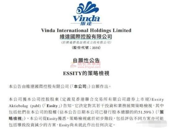 紙引未來(lái)訊近日,維達(dá)國(guó)際(03331.HK)的控股股東瑞典Essity AB(愛(ài)適瑞)公布,正考慮出售維達(dá)大部分股份,據(jù)稱Essity正在討論出售部分或手上全部51.59%的維達(dá)股權(quán)。