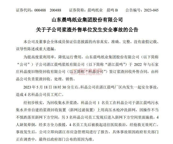 公告顯示,5月18日18時30分左右,科晶公司在湛江晨鳴廠區內發生一起安全事故,造成4名科晶公司員工死亡。經初步核實,為回收集水井漿渣,科晶公司1名員工在科晶公司于湛江晨鳴污水集水井旁自建的漿渣回收裝置(斜網過濾裝置)上用高壓水槍沖洗斜網,因操作不當不慎跌落至斜網下方空間,另3名科晶公司員工發現后進入斜網下方空間里面施救,4人缺氧暈倒,經多方全力救援,4名員工先后被救起送往醫院救治,經搶救無效死亡。事故發生后,公司立即向湛江市應急管理局進行了報告,具體事故原因政府有關部門正在調查中,最終以政府部門公布的原因為準。