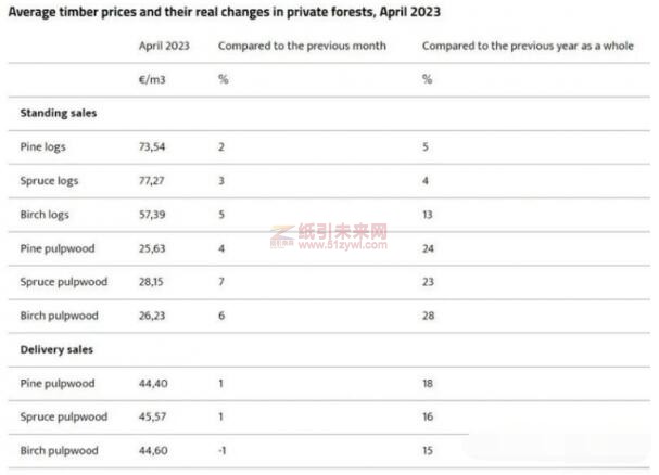 紙漿木材的平均立木銷售價格每月上漲4—7%,比去年全年上漲23—28%。云杉的平均價格上漲至28.2歐/立方米,樺木上漲至26.2歐/立方米,松木上漲至25.6歐/立方米。