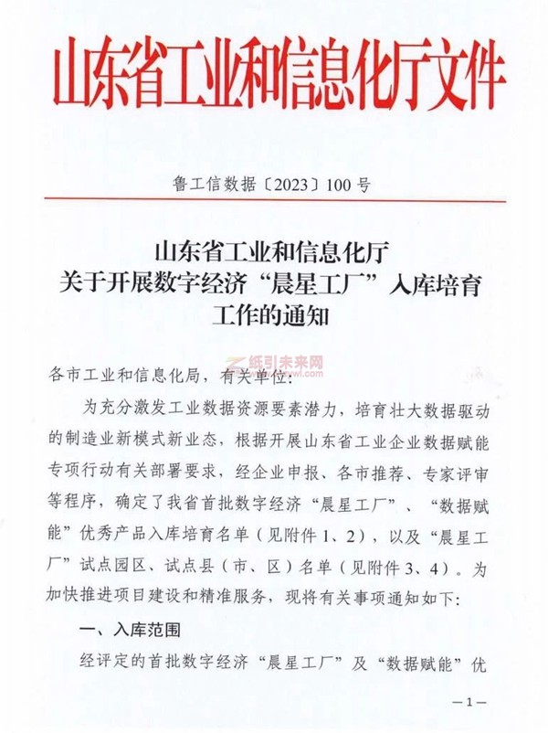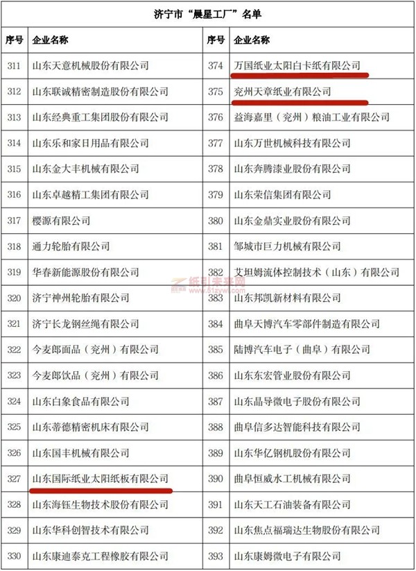 紙引未來網訊日前,山東省工業和信息化廳下發《關于開展數字經濟“晨星工廠”入庫培育工作的通知》,宣布首批山東省級數字經濟“晨星工廠”入庫培育名單。公司控股股東山東太陽控股集團有限公司旗下兗州天章紙業有限公司、太陽紙業有限公司、萬國紙業太陽白卡紙有限公司等6家單位成功入選。
