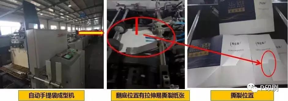 1、自動手提袋成型機的翻底裝置,相比人工成袋,更容易造成紙張撕裂,應特別注意保持正常的環境溫濕度(23±3℃,50± 5%);