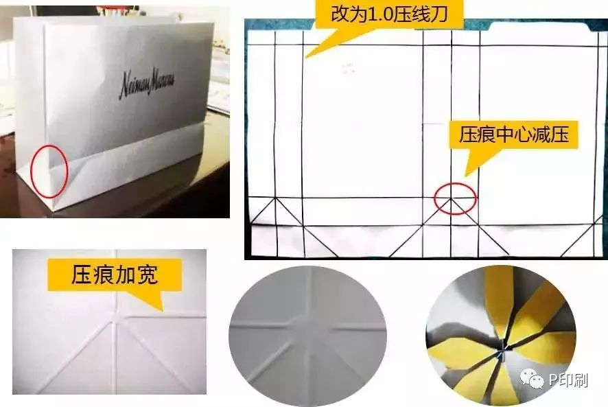 紙袋須考慮雙層紙位置的折疊半徑足夠承受壓痕的外部拉力,壓痕刀寬度建議加寬一級。