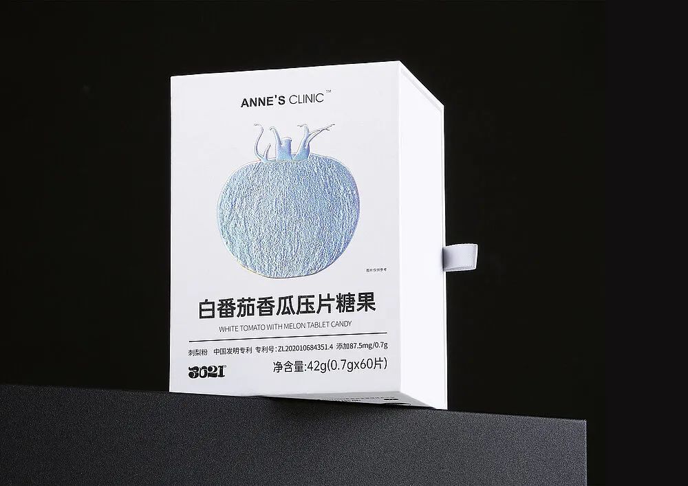 通過浮雕和銀色激光印刷,插圖水果在禮品包裝和內部玻璃瓶的標簽上都得到了優雅的展示。襯墊良好的鑲嵌物可以保護產品免受沖擊,并將信息卡固定在凹槽中。平面設計以一種克制的方式在外包裝上構建了關鍵的視覺框架,從而有助于時尚的展示。