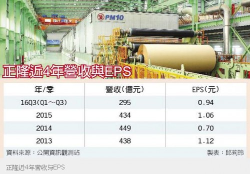 正隆日前宣布,為反應原物料、船運、環保成本上揚及人工費用增加,自今(2017)年元月起調漲工紙價格每噸新臺幣1,500元,漲幅約為12~15%,業界認為,此舉能夠抒解業者營運壓力、改善獲利狀況,可望影響其他造紙業者跟進反應。