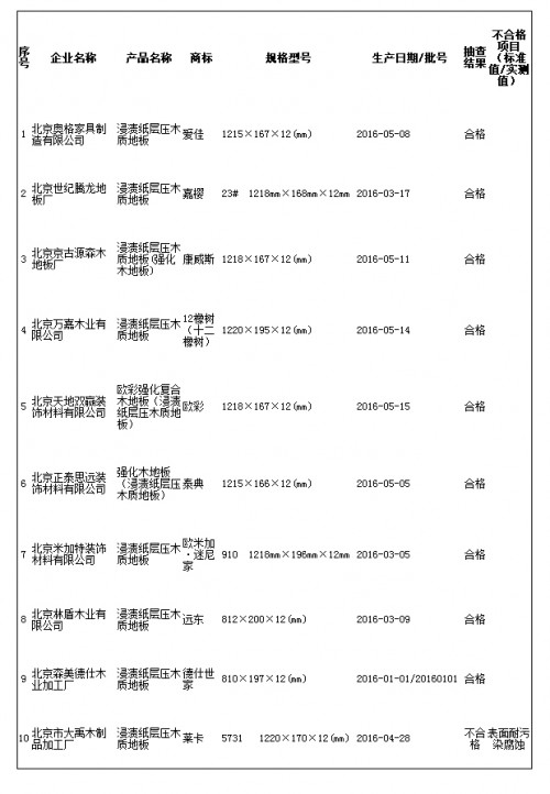 10月9日,北京市質量技術監督局官網公布了北京市生產領域浸漬紙層壓木質地板(強化木地板)產品全國質量監督聯動抽查結果,共抽查北京市10家企業生產的10批次產品,其中1批次產品不符合標準規定。