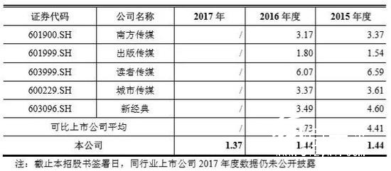 從中信出版的存貨周轉中可嗅出數字時代下的一絲危機。2015年~2017年,公司周轉率(次/年)分別為1.44、1.44、1.37,呈下降態勢,與同行業上市公司對比情況如下: