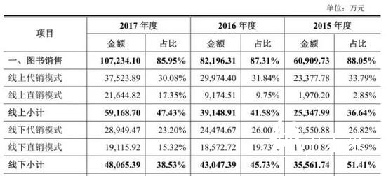 進一步細化可以看到,當前中信出版的圖書銷售線上成交金額(5.92億元)略高于線下(4.81億元)。近年來,中信出版線下銷售額增長緩慢,2015年~2017年公司線下銷售額占主營業務收入的比例分別為51.41%、45.73%、38.53%。