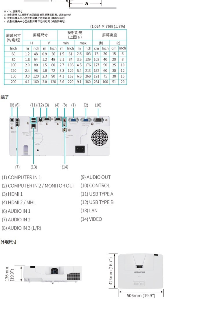 5、終端接口:HDMI輸入:HDMI端子×2 ;無PC演示/無線網絡:USB(A)×2(USB無線網卡為選購件) ,網絡端口:RJ-45端子×1USB鼠標控制:USB(B)×1,計算機接口:15針D-Sub×2 輸入, 15針D-Sub× 1輸出;控制端口:9針232控制微型 D-sub×1個;RCA端口×1;自動適應WXGA寬屏筆記本分辨率