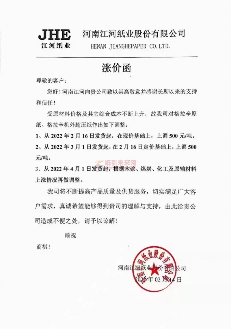 河南江河紙業(yè)股份有限公司:受原材料價格及其它綜合成本不斷上升,故我司對格拉辛原紙、格拉辛機外超壓紙作出如下調整: