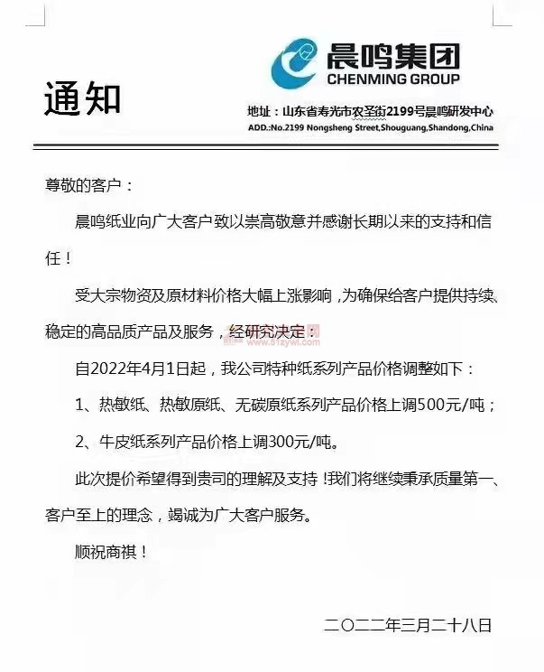 【通知】2022年3月28日晨鳴集團(tuán)漲價(jià)函