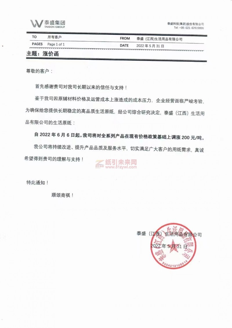 泰盛(江西)生活用品有限公司的生活原紙:自2022年6月6日起,我司將對(duì)全系列產(chǎn)品在現(xiàn)有價(jià)格政策基礎(chǔ)上調(diào)漲200元/噸。