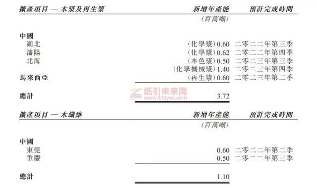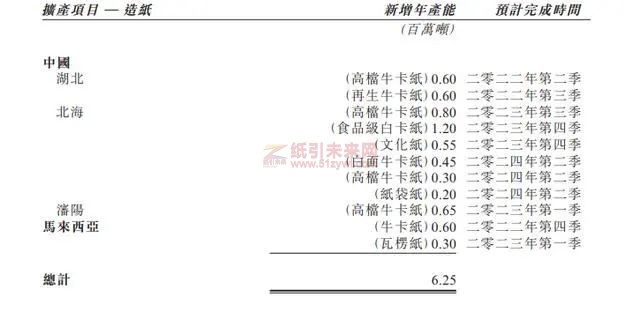 截至2021年12月31日止,玖龍紙業集團造紙總設計年產能為1757萬噸。隨著湖北新基地的240萬噸及馬來西亞基地的60萬噸卡紙產能投產;加上其他造紙項目,未來集團造紙產能將達到2382萬噸。