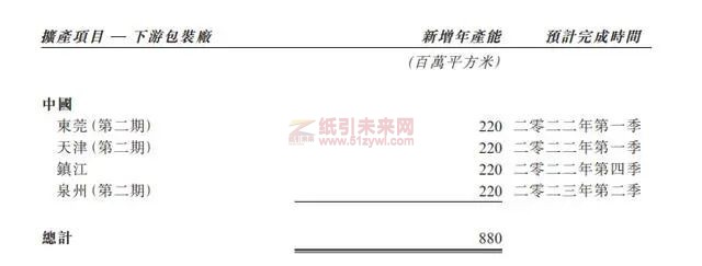 另外,集團正在有序地發展下游包裝業務,開拓新客源,為終端客戶提供一站式高品質產品及服務,借此差異化搶占市場份額。截至2021年12月31日止,集團下游總設計年產能約20億平方米(部分瓦楞紙板用以內部生產瓦楞紙箱),預計于2022及2023年將分別增加6.6及2.2億平方米年產能。