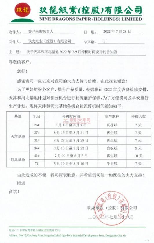 【停機函】2022年7-9月天津和河北玖龍紙業停機告知函