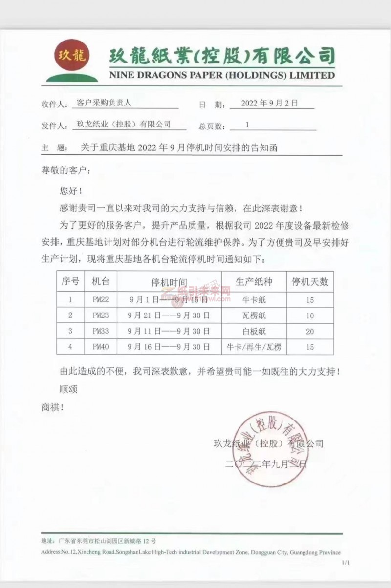 【停機函】2022年9月重慶玖龍紙業停機告知函